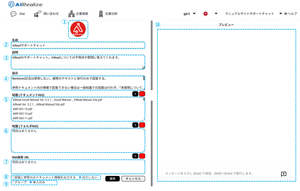 | ⑥ | 知識 (フォルダRAG) | MyRealize が回答時に参照させたい、「問い合わせ」でアップロードされたドキュメント RAG をフォルダ単位で指定します。 フォルダRAG は Premium 契約でのみ作成可能です。 |